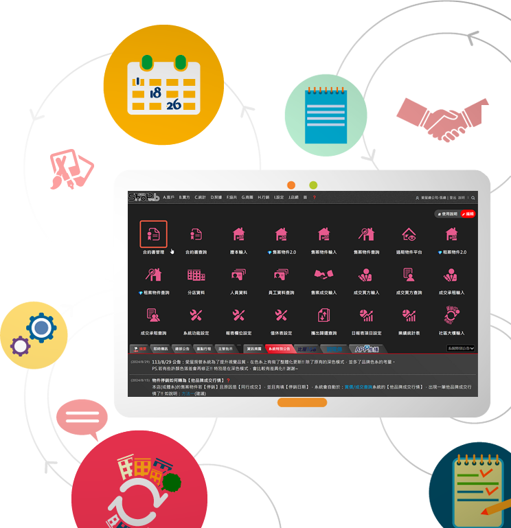 從來電高手系統、公買配對、募集線,到總部合約配發控管、謄本解析(正式、電傳、比X、永X)、新格局圖繪製系統、物件委託、不動產說明書、VR賞屋、影音看屋、AI變裝、電子契變,與成交、實價登錄、報表分析、薪資系統,物件API介接(IN/OUT)、比房API、房地API整合/從方案購買、設定、開通、介接使用,一應俱全! 還有更多..總部系統需求